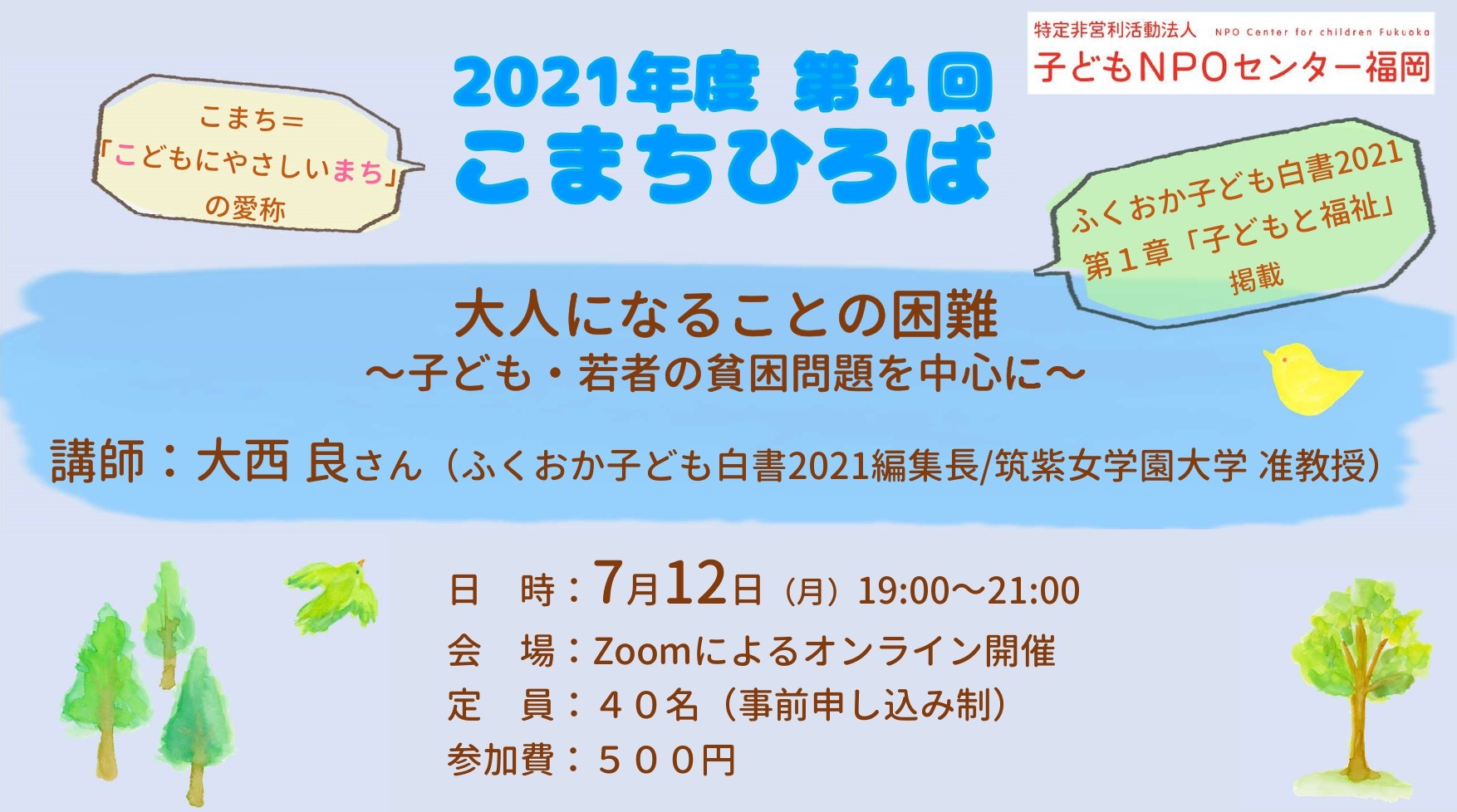 7月のこまちひろばは、今年3月に発行した「ふくおか子ども白書2021」の編集長 大西さんからお話をききます。
