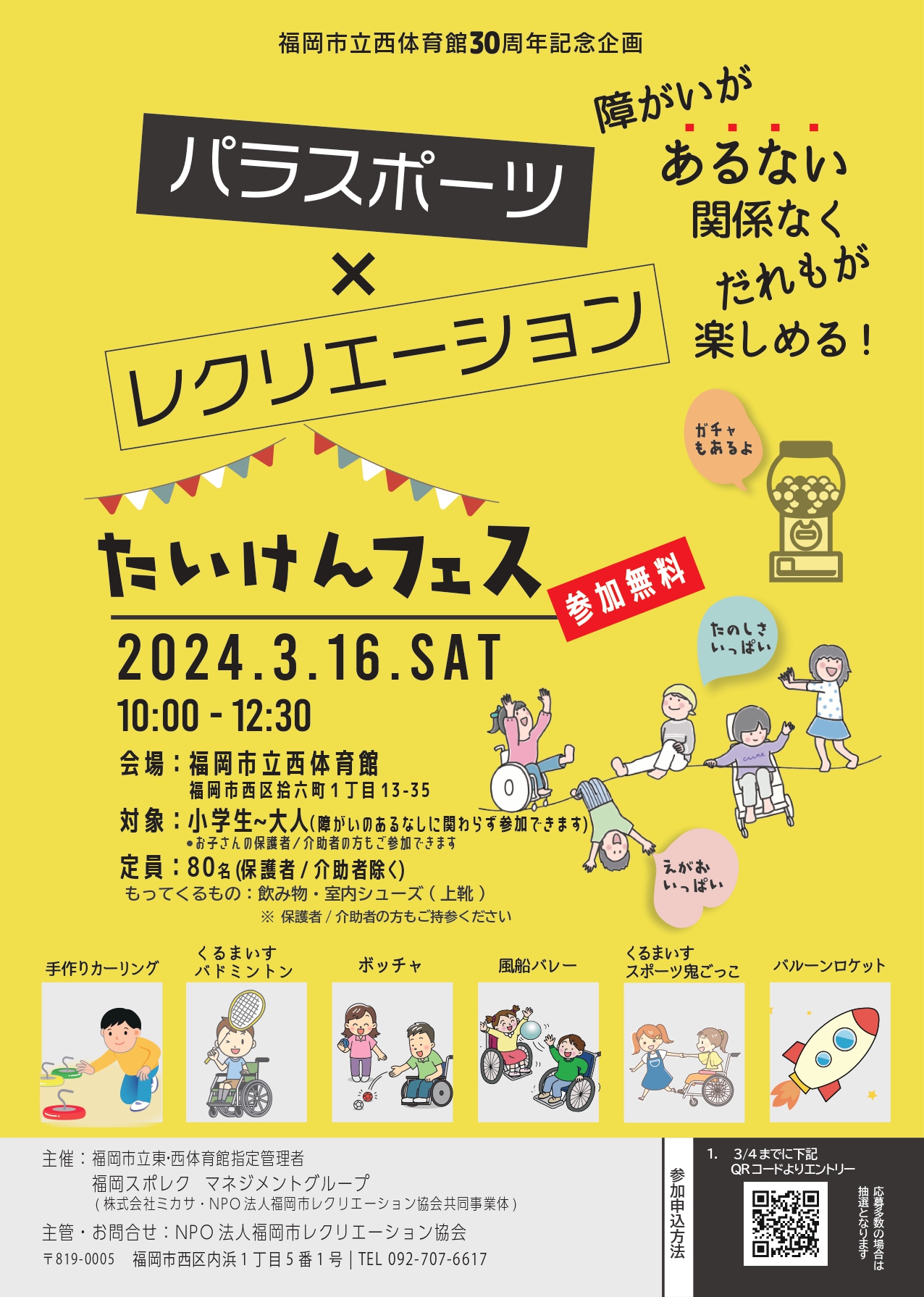 【参加無料】要事前申込/福岡市立西体育館30周年記念企画「パラスポーツ×レクリエーションたいけんフェス」開催のお知らせ
