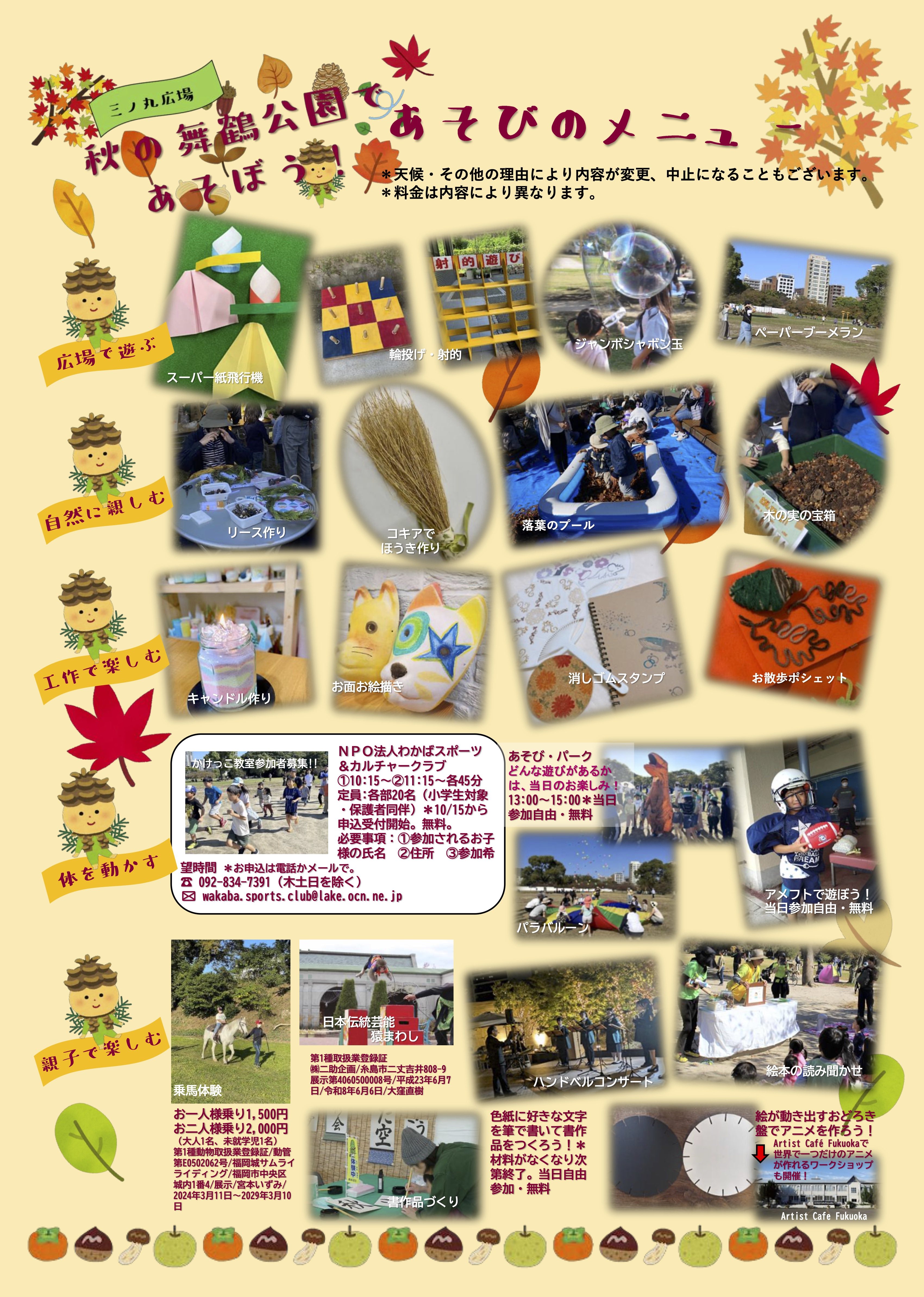 大人も子どもも、みんなで舞鶴公園で一緒に体を動かしてボールで遊びましょう。会場は土のグランドです!動きやすい服装でお越しください。また、みどりのまちマルシェも同時開催で、