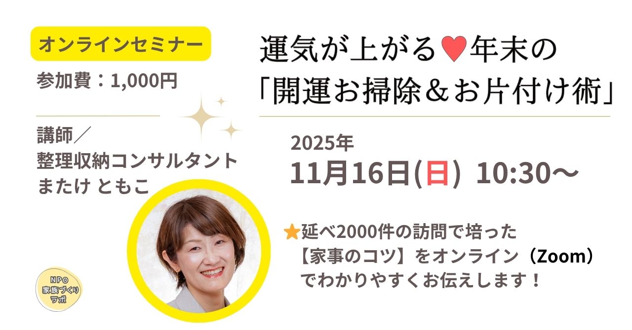 11月16日(日) 運気が上がる♥年末の 「開運お掃除&お片付け術」【オンラインセミナー】