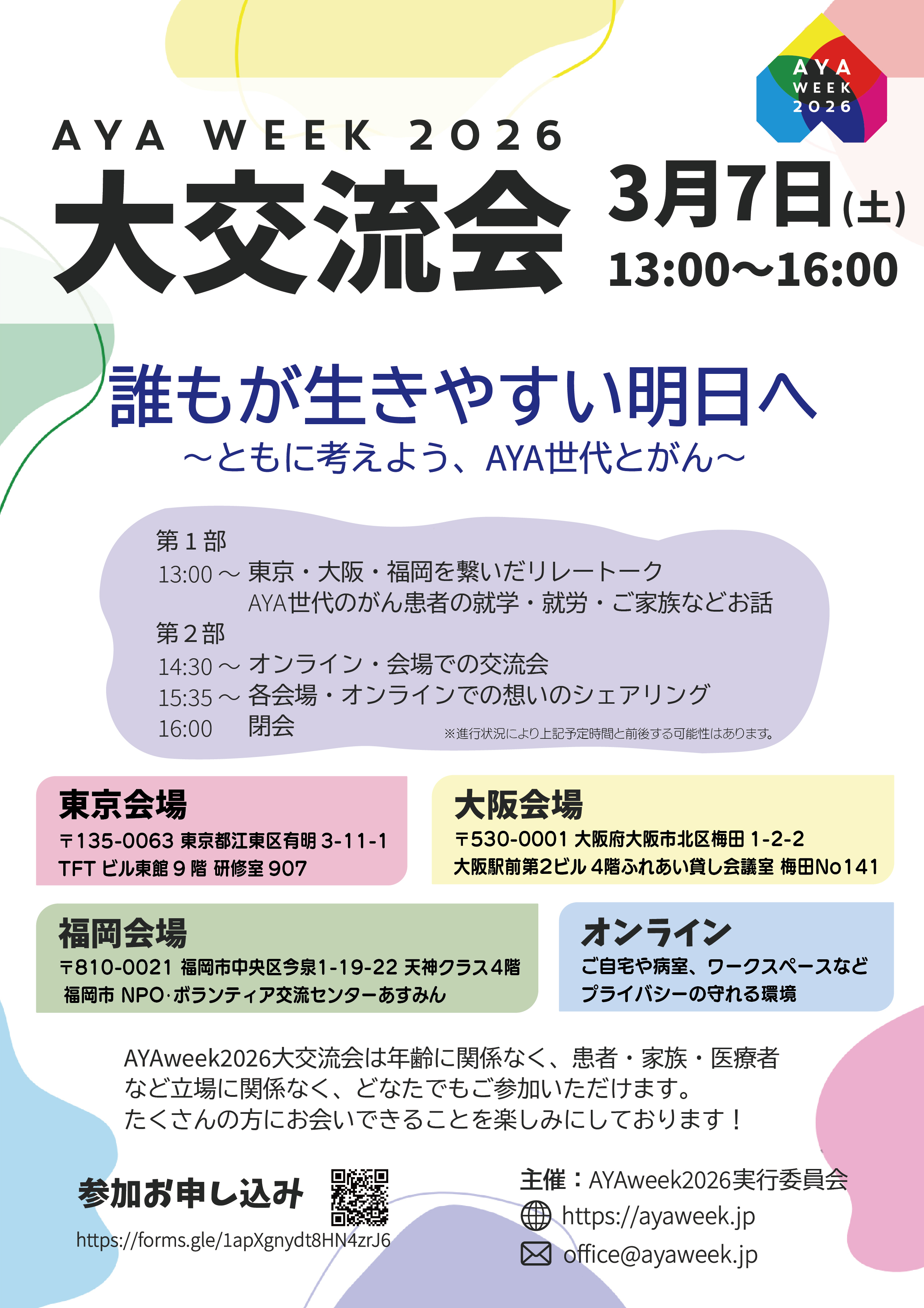 「AYAweek2026」では、『誰もは生きやすい明日へ〜ともに考えよう、AYA世代とがん〜』をキーメッセージに、啓発活動を展開します。