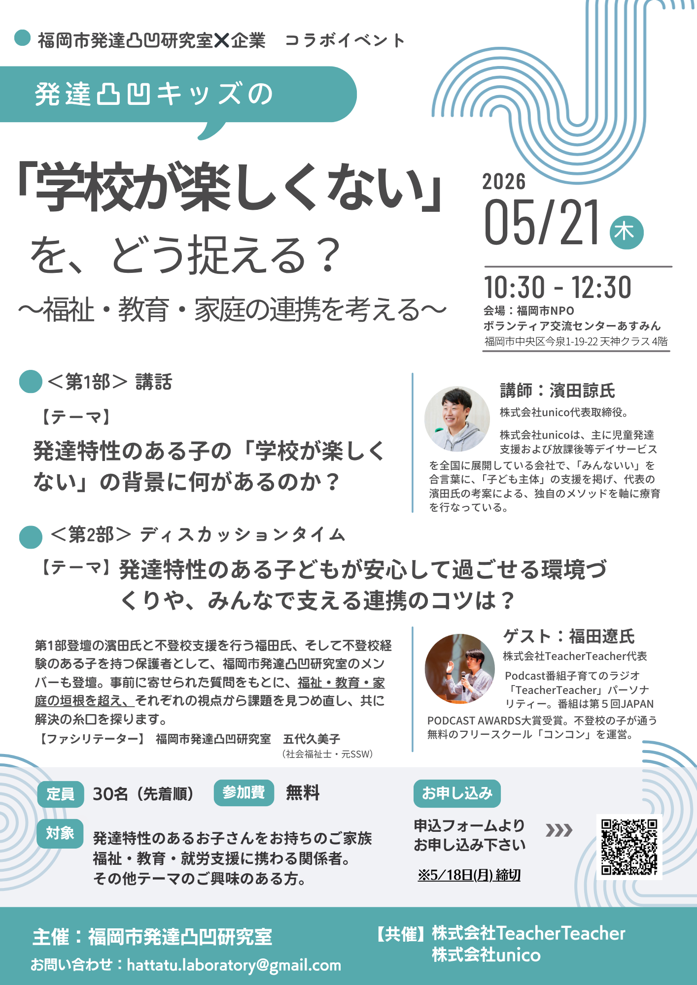 福岡市発達凸凹研究室、5月の企画は、企業コラボイベントとして「発達凸凹キッズの『学校が楽しくない』を、どう捉える?」 を開催します!