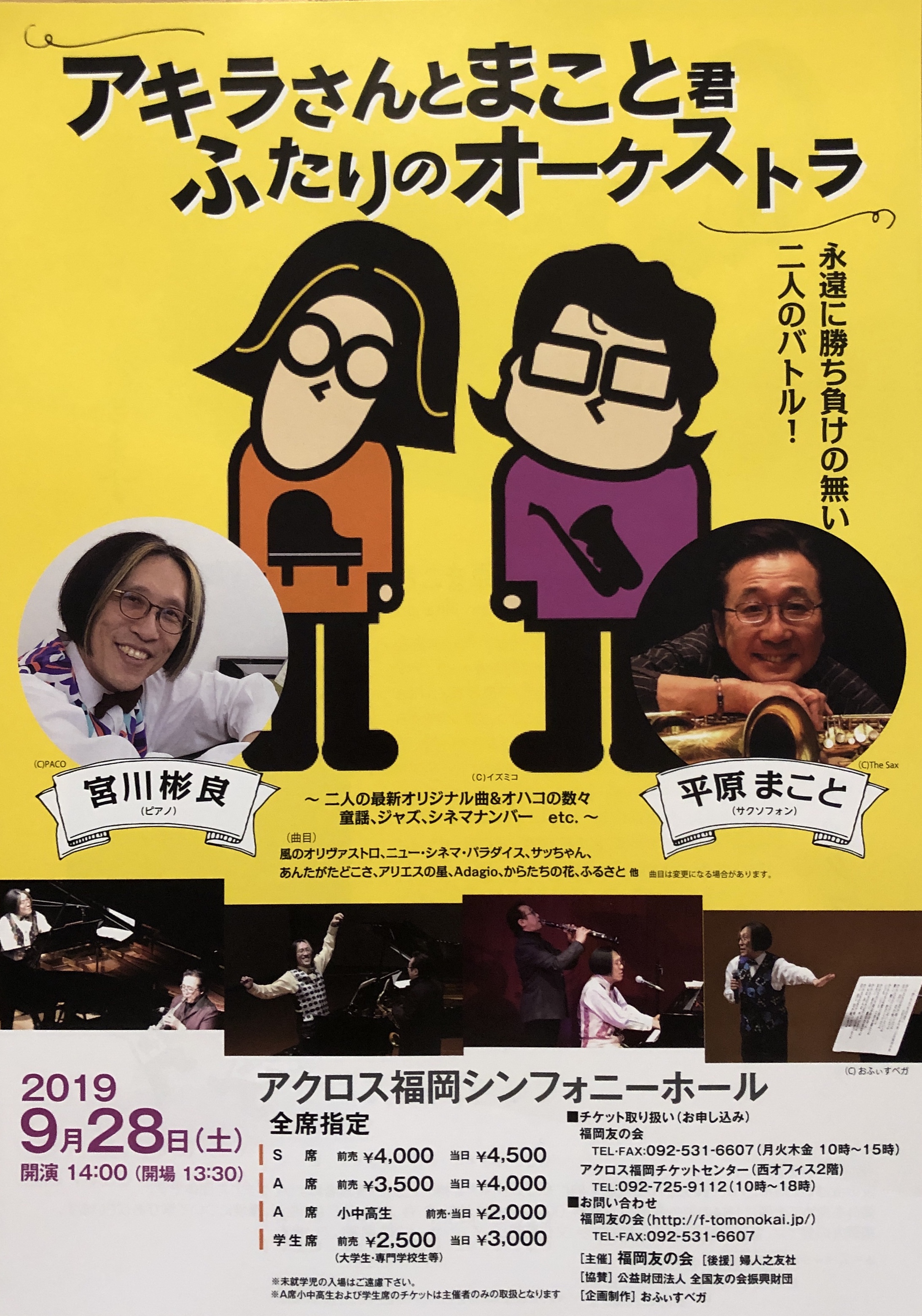 今回は、「アキラさんとまこと君 ふたりのオーケストラ」と題して、宮川彬良さんのピアノと平原まことさんのサックスによるコラボコンサートです。宮川彬良さんは、作曲家宮川泰さんのご子息でNHK Eテレでも楽しい番組を作っていらっしゃいます。平原まことさんは、歌手・平原綾香さんのお父様で、フランク・シナトラなどの海外アーティストのコンサートにも参加されたサックス奏者です。